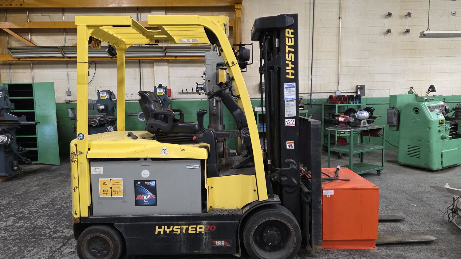 - Hyster E70XN-40 Electric 4-Wheel forklift w/ 7,000lbs cap, 188″ lift, 3-stage mast, side shift, & hydraulic adjustable forks
