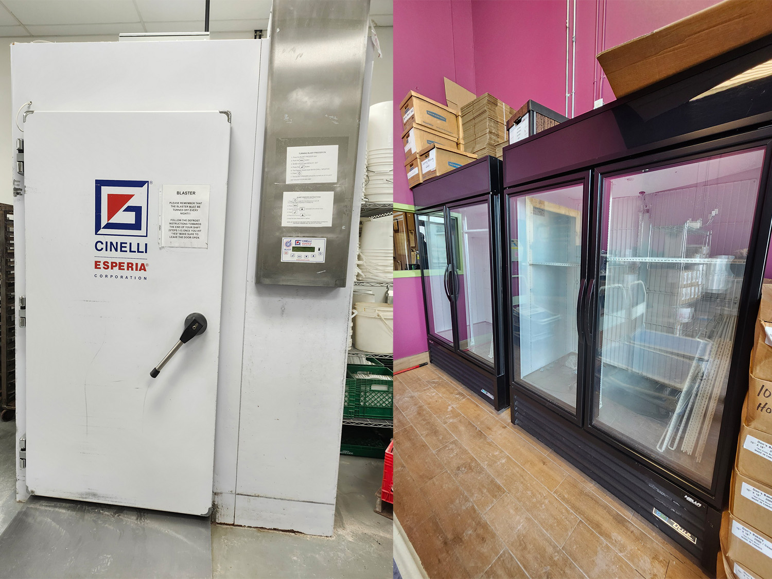 - 2017 Cinelli Esperia walk in combo freezer / fridge (29’L x 12.9’W x 8.4’H) w/ (3) entrance doors, Keeprite 3-fan evaporators & condensing units